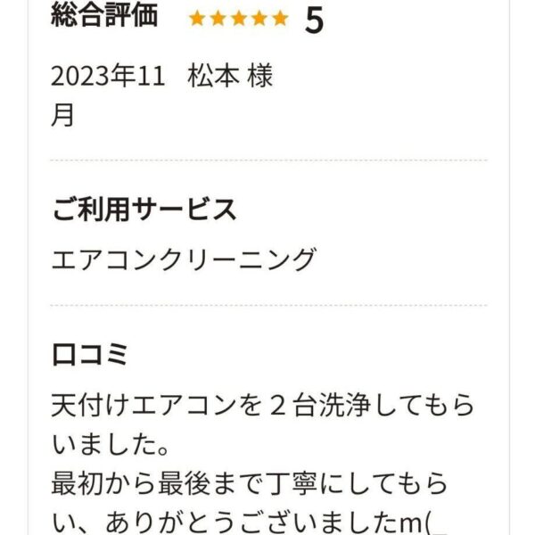 業務用の天付けエアコンを2台洗浄してもらいました。最初から最後まで丁寧にしてもらい、ありがとうございました。 -