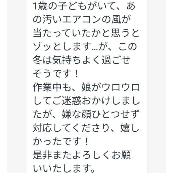 一歳の子供がいて、あの汚いエアコンの風が当たっていたかと思うとゾッとします...が。この冬は気持ちよく過ごせそうです!作業中も、娘がウロウロしてご迷惑おかけしましたが、嫌な顔ひとつせず対応してくださり、