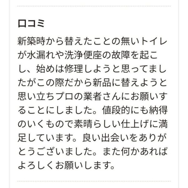 新築時から変えたことのないトイレが水漏れ、洗浄便座の故障を起こし、初めは修理しようと思っていましたがこの際だから新品に替えようと思い立ちプロの業者さんにお願いすることにしました。値段的にも納得のいくもので素晴らしい仕上げに満足しています。良い出会いをありがとうございました。また何かあればよろしくお願いいたします。 -